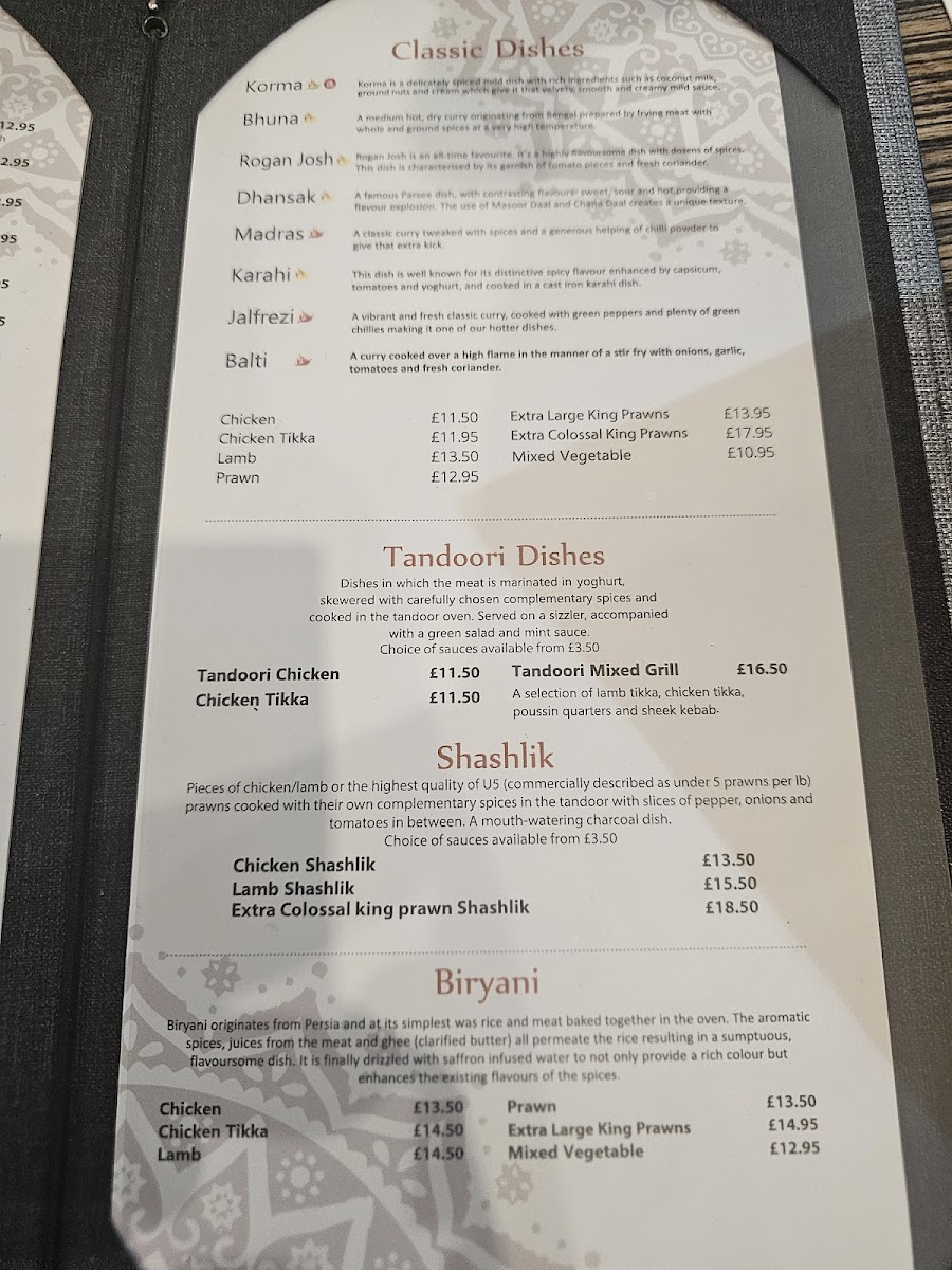 The starters are particularly impressive, with favorites like onion bhajis and samosas, which are perfectly spiced and fried to a golden crisp. The main courses, however, truly steal the show. The chicken tikka masala is a crowd favorite, blending tender pieces of chicken with a rich, slightly smoky tomato sauce. For seafood lovers, the prawn masala offers a delightful combination of juicy prawns and aromatic spices that are sure to leave a lasting impression.